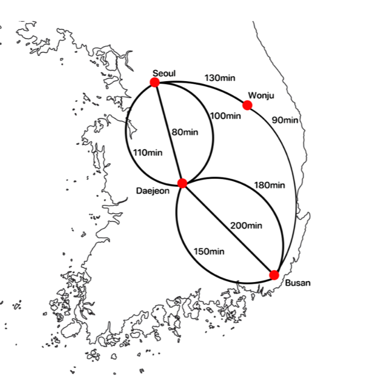 다음과 같이 서울에서 부산을 가는 경로가 있다고 해보자.