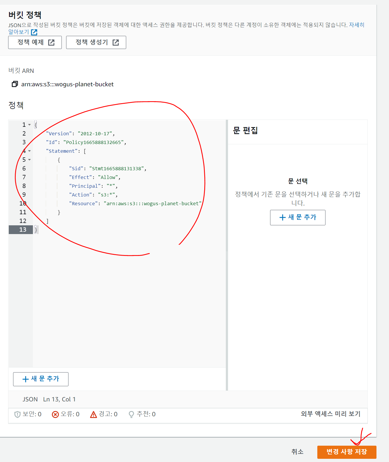 복사한걸 버킷정책에 붙여넣고 저장해주자!