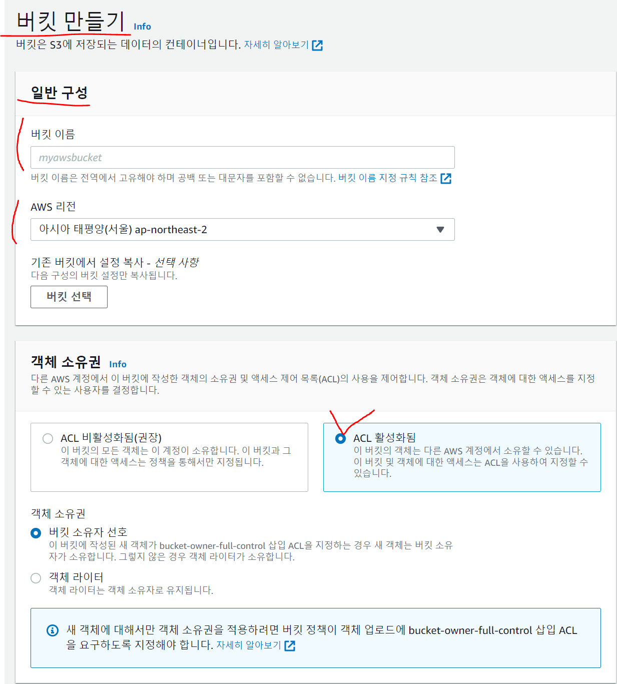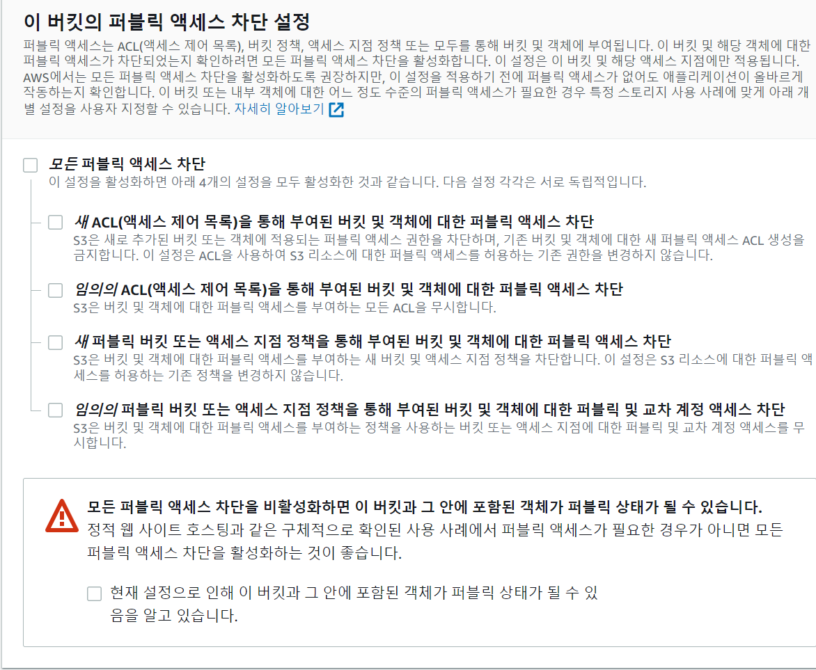버킷생성 눌러주고 체크한 부분만 신경써준다!