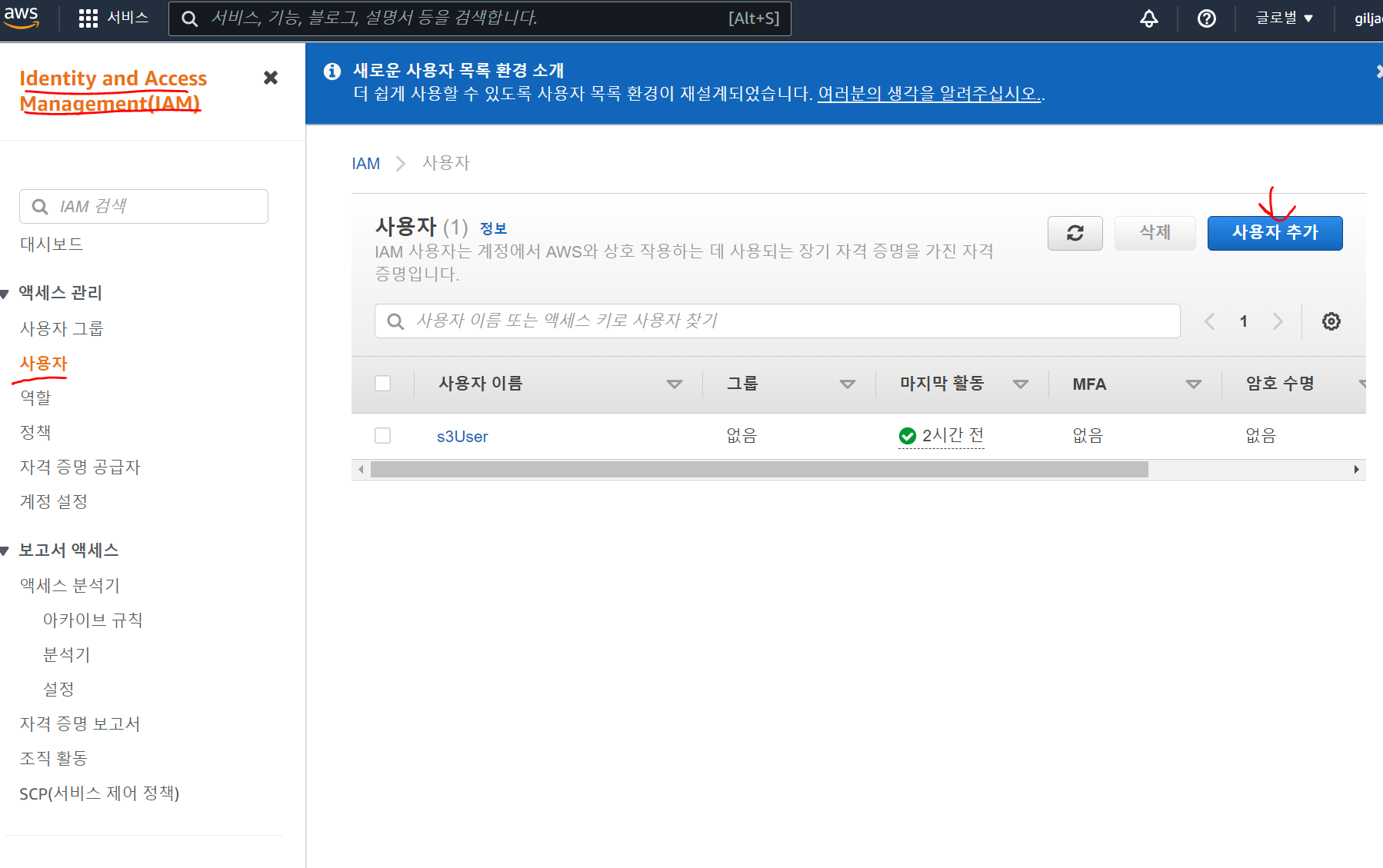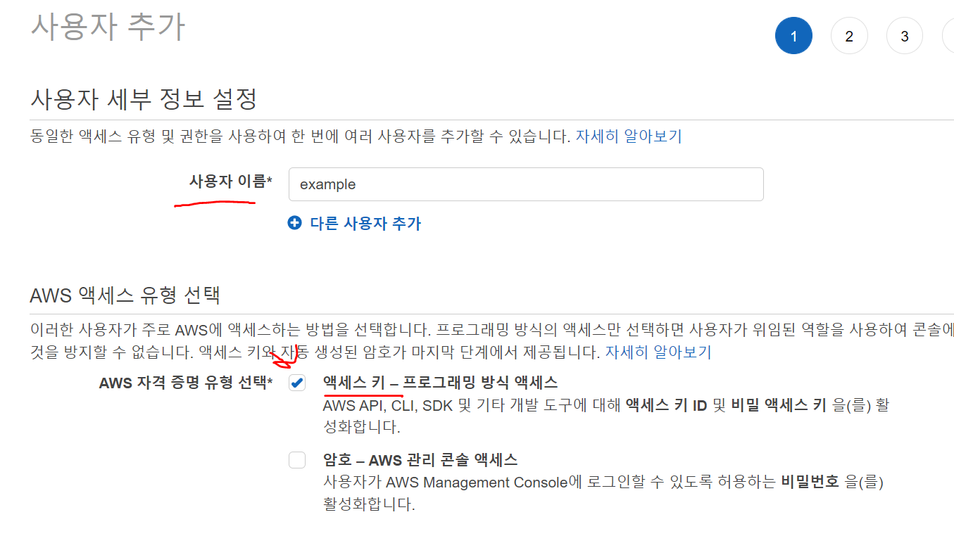 오른쪽위에 내 계정 누르고 -> 보안자격증명 누르고 -> 사용자 -> 사용자추가