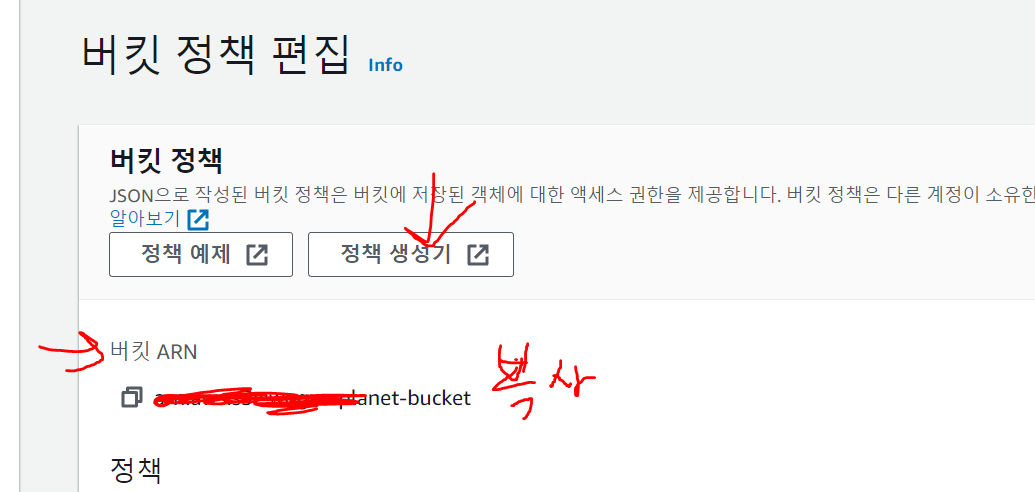 버킷생성후! 버킷클릭 -> 권한 -> 버킷정책 -> 편집 ( 버킷 ARN 복사)