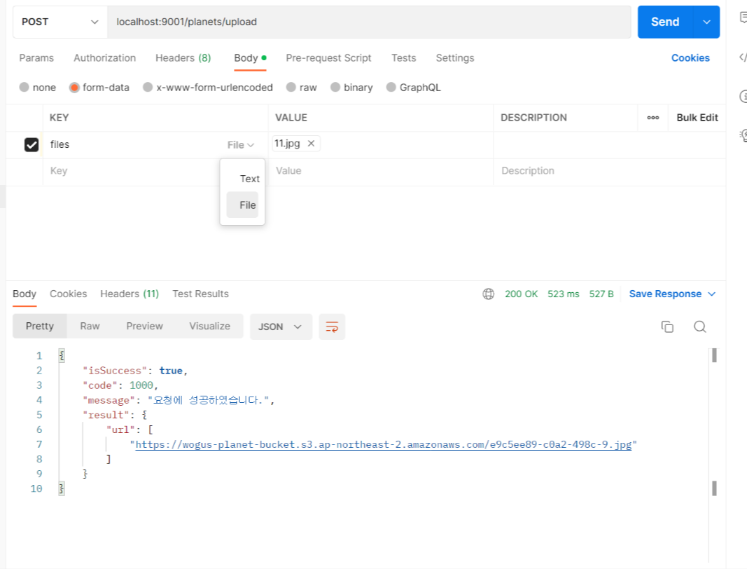 포스트맨에서 Body에서 form-data를 선택