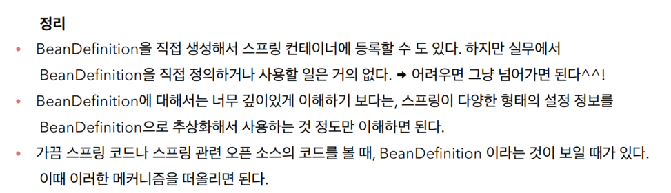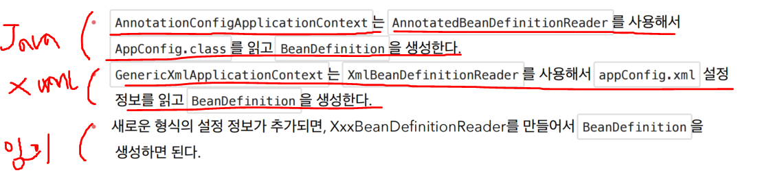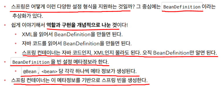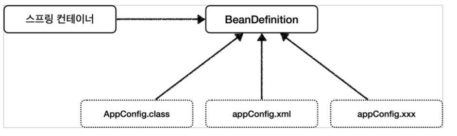 그 BeanDefinition이 자바로 된건지 xml로 된건지 뭐로된건지는 신경안쓴다 ( 역할에 의존한다. 구현에 의존하지않고)