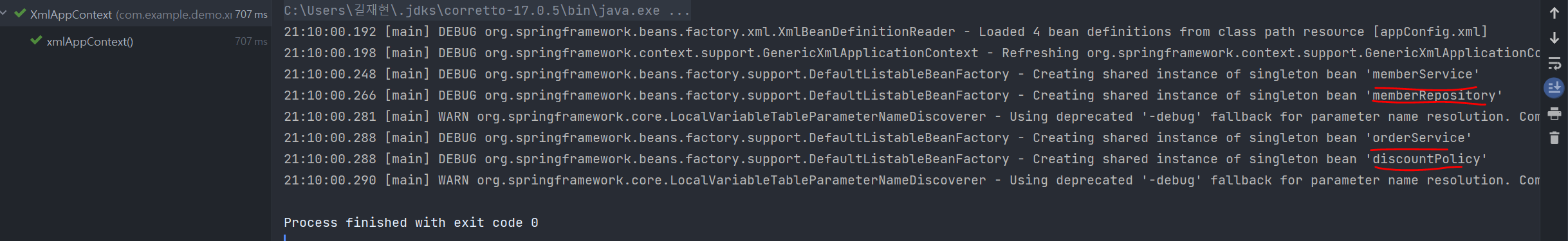 xml 파일로도 스프링컨테이너에 빈이 잘 등록되는것을 확인할 수 있었다.