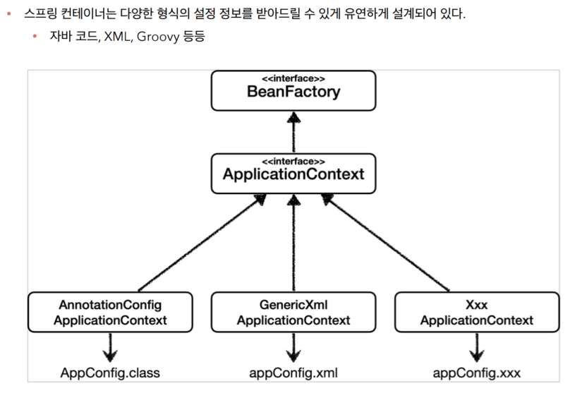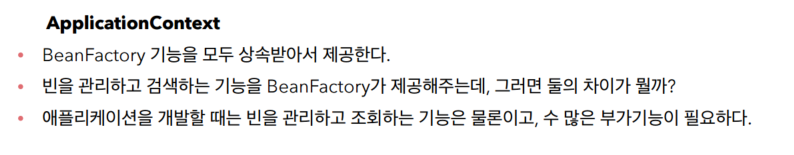 - 빈팩토리와 차이는 뭘까? -> 빈을 관리하고 조회하는 기능(빈팩토리)은 물론이고 수많은 부가기능이 필요하기 때문에