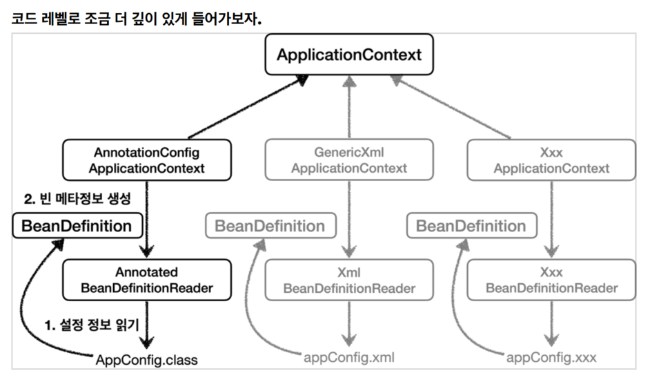 Reader를 사용해서 AppConfig.class를 읽고 BeanDefinition(빈 메타정보)을 생성한다.