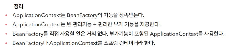 - 이전 시간에 썼던 getBean()과 같이 사용했던 대부분의 기능은 빈팩토리에서 제공하는 기능이였다.