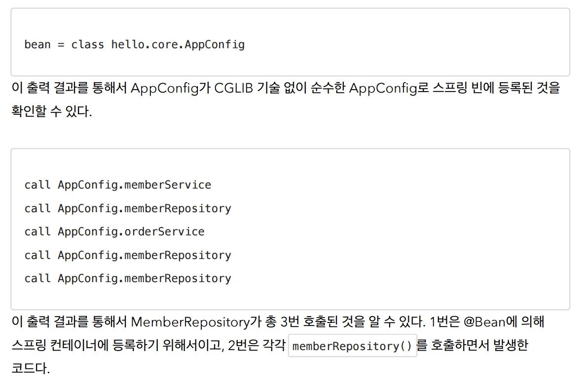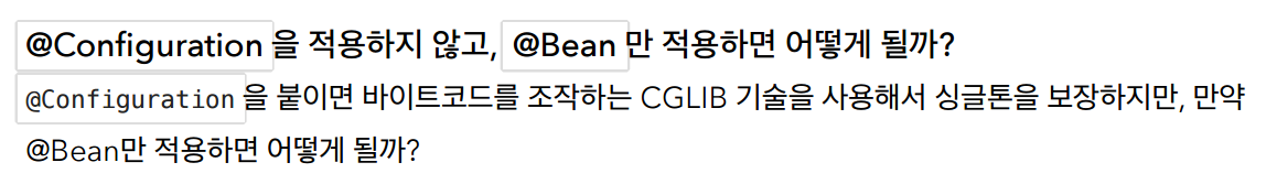 @Configuration을 붙여야 CGLIB 기술을 이용해서 스프링컨테이너가 싱글톤패턴을 보장해준다!