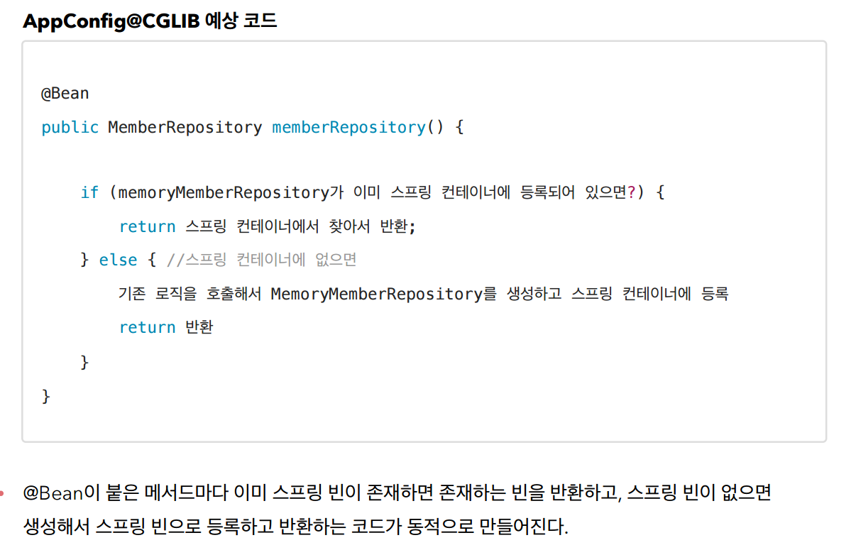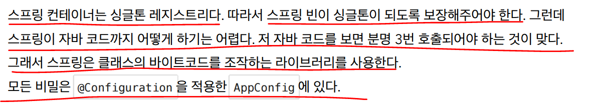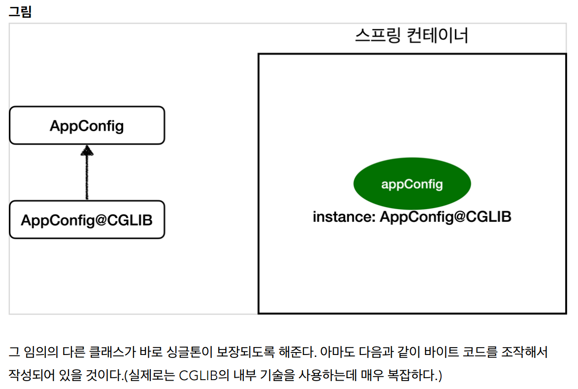 어떻게 보장해주냐 -> 스프링컨테이너를 생성할때 전달하는 구성설정파일을 상속한 새로운 클래스를 스프링빈으로 등록하는데 그 새로운 클래스안에 CGLIB이라는 바이트코드 조작 라이브러리를 이용해서 싱글톤을 보장해준다.