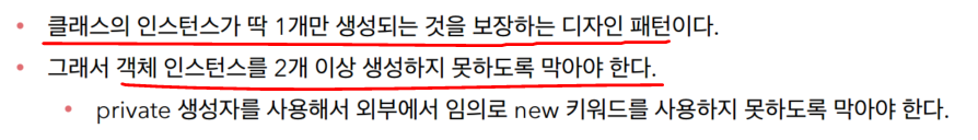 클래스의 인스턴스가 딱 1개 생성되는것을 보장하는 디자인 패턴이다.