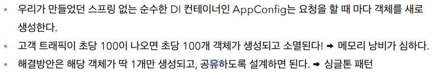 배운내용을 가지고 AppConfig.java 가서 싱글톤패턴 적용하면 싱글톤이 잘 적용된다.