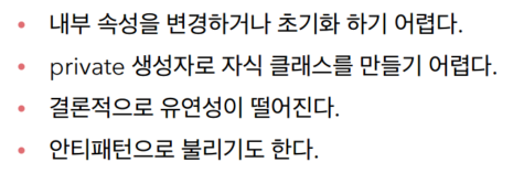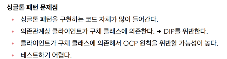 클라이언트가 구체클래스.getInstance()메소드를 사용해야해서 DIP를 위반한다, OCP 위반할 가능성이 높다.