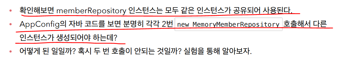 반복 실행되야했던 멤버리포지토리 메소드에 저런 로직을 사용해서 여러개의 메모리멤버리포지토리가 생성되는것을 막는다.