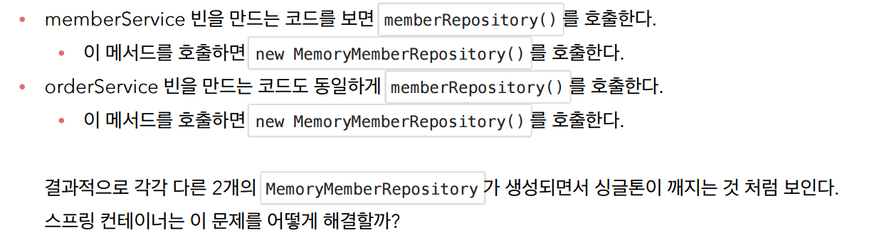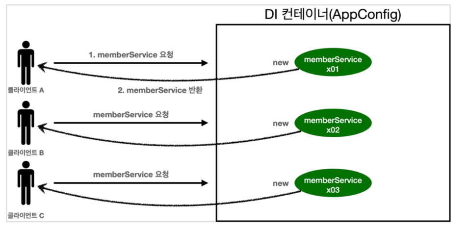 예전에 스프링컨테이너(ApplicationContext)없이 직접 AppConfig 객체를 만들고 AppConfig의 메소드를 이용해서 원하는 객체를 생성했던것처럼 호출할때마다 새로운 멤버서비스를 생성하게 될것이다.
