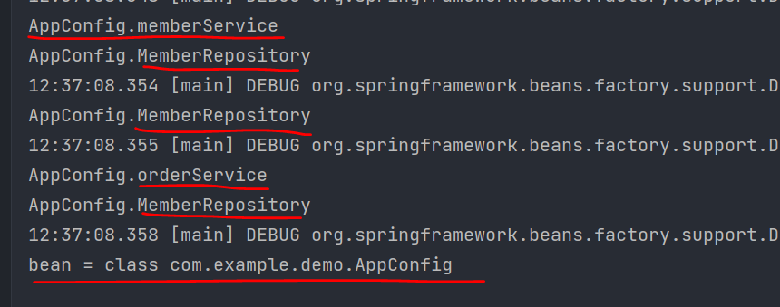 스프링컨테이너가 생성되고, AppConfig를 통해 스프링빈이 등록되면서 출력이 된 모습이다.