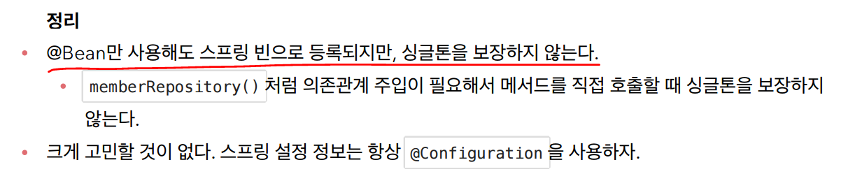 결론 @Configuration을 같이 사용해야 싱글톤이 보장된다. -> 하지만 @Autowired로 해결할 수 있기는하다.
