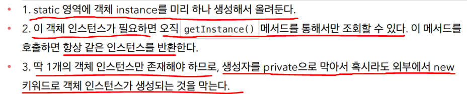 private static final SingletonService instance = new SingletonService(); // 자기자신을 내부에 private static으로 가지고있는다.