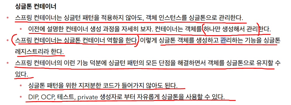 스프링 컨테이너는 싱글톤 패턴의 문제점을 해결하면서,