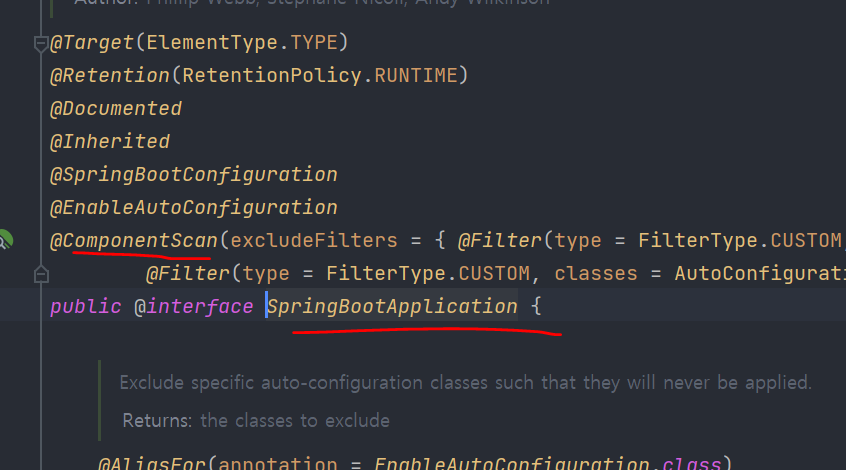 내용을 보면 @SpringBootApplication이 있고 @SpringBootApplication를 클릭해서 들어가보면