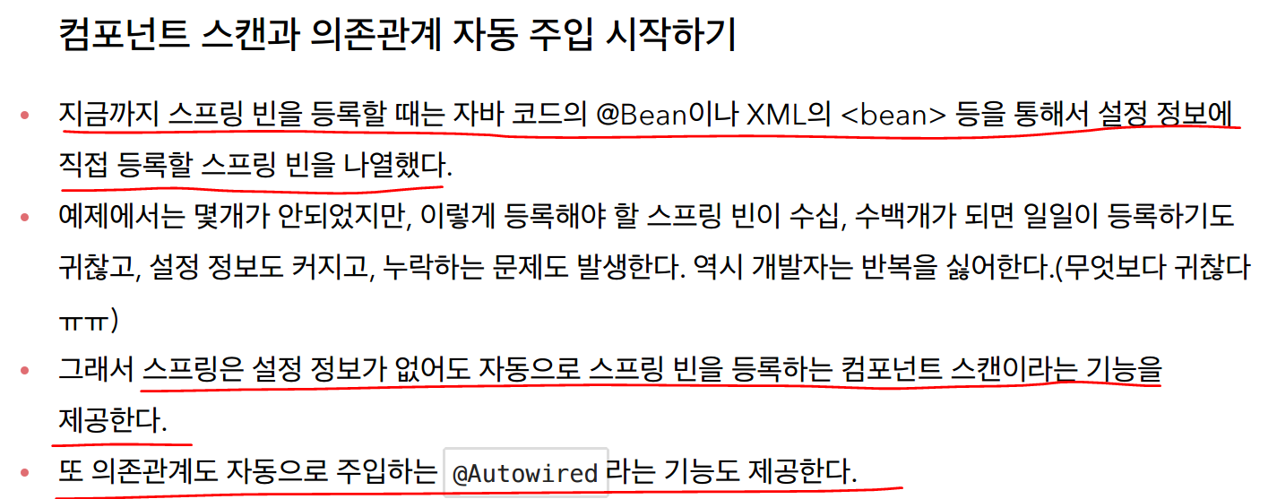 하지만 등록해야하는 스프링빈이 많아지면 설정 정보도 커지고 누락하는 문제가 발생한다. ( + 귀찮음)