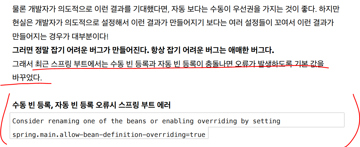 스프링부트 실행 클래스를 실행시 등록된 빈중 중복된 이름을 가진 빈이 있다면 아예 오류메시지를 띄우면서 스프링이 안올라간다.