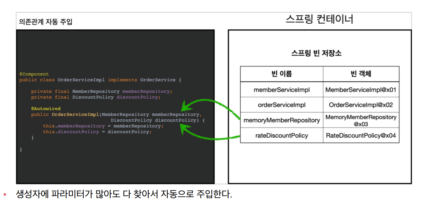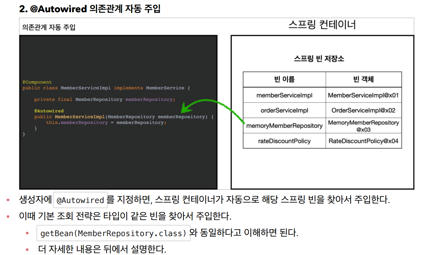 @Autowired가 붙어있으면 전달인자인 MemberRepository를 보고 스프링컨테이너에 에서 알맞은 빈을 꺼내다 주입해준다.