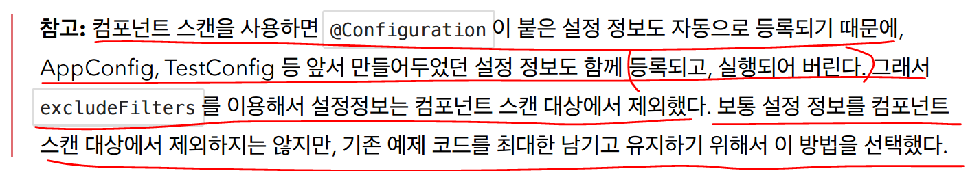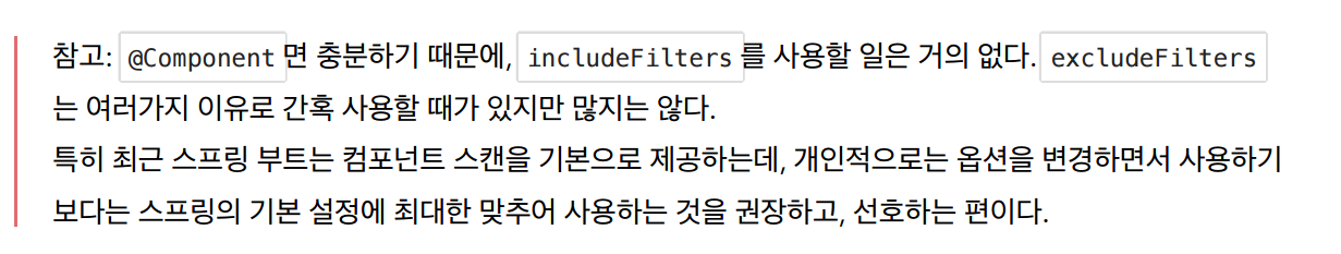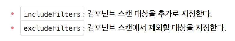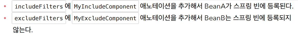 excludeFilters = @ComponentScan.Filter(type = FilterType.ANNOTATION, classes = MyexcludeComponent.class) // 스캔 제외 설정