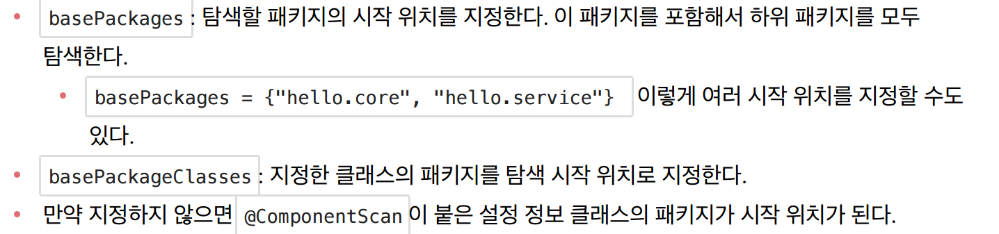 모든 자바 클래스를 컴포넌트 스캔하면 시간이 오래걸린다. 그래서 꼭 필요한 위치부터 탐색하도록 시작위치를 지정할 수 있다.
