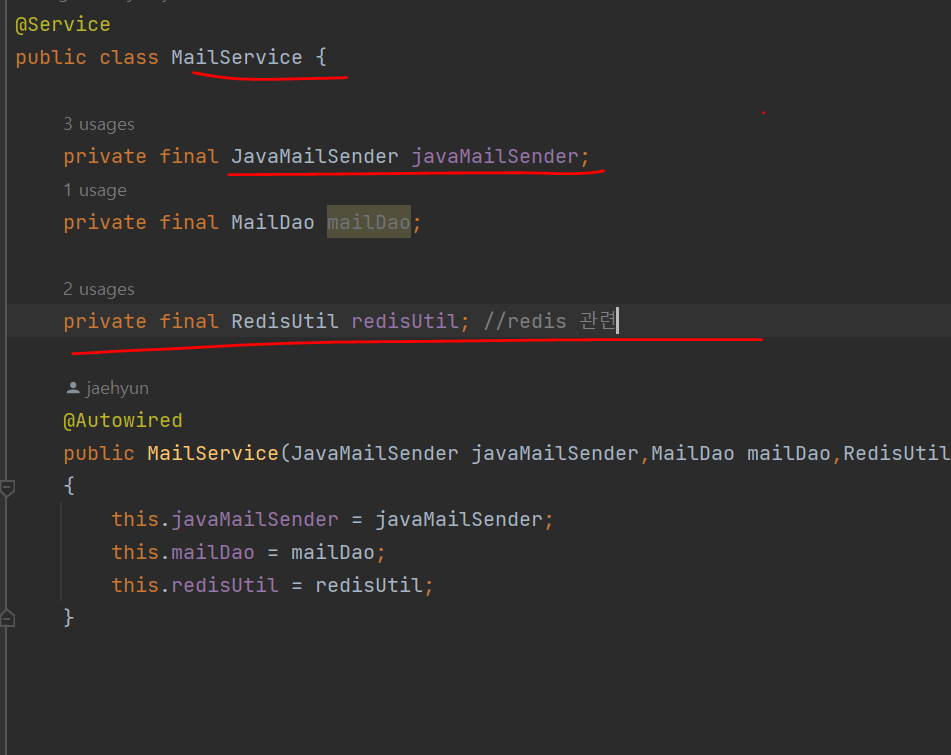 아까 Mailservice에서 JavaMailSender는 메일을 보낼때 필요한 부분이고