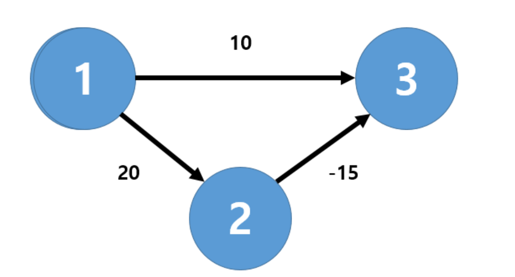 다익스트라는 1->3 경로인 10이 구해질것이다. (그리디 알고리즘이니까 매 선택시 가장 낮은 비용을 선택한다)