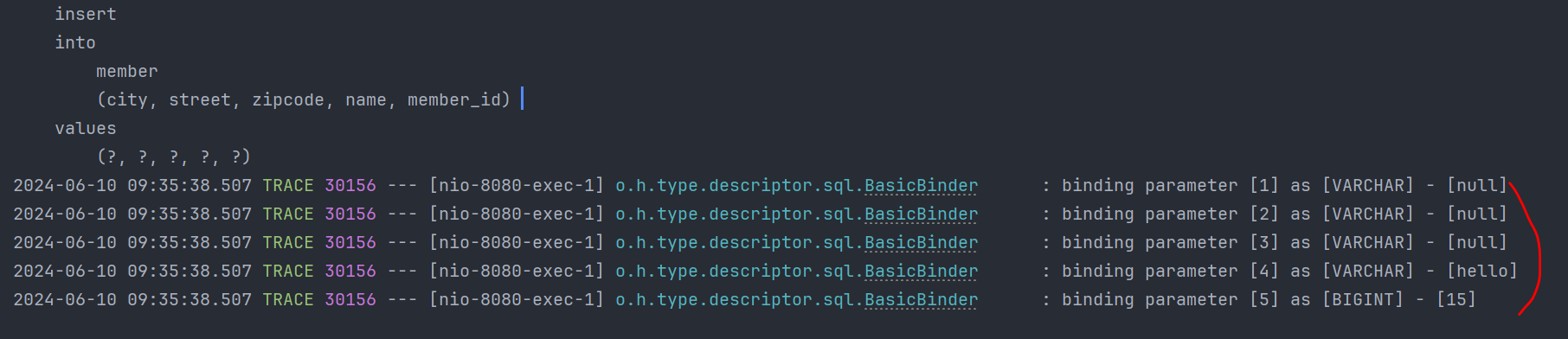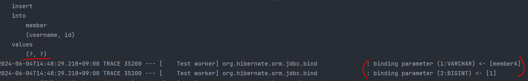 org.hibernate.orm.jdbc.bind: trace # jpa가 생성하는 쿼리의 파라미터 보이게하기