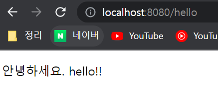 return "hello"; //hello.html과 같은 뜻이다. hello라는 html로 이동한다는것이고 이동하면서 model을 같이 전달하는것 같다. 해당 html은 resources -> templates에 저장하는게 관례