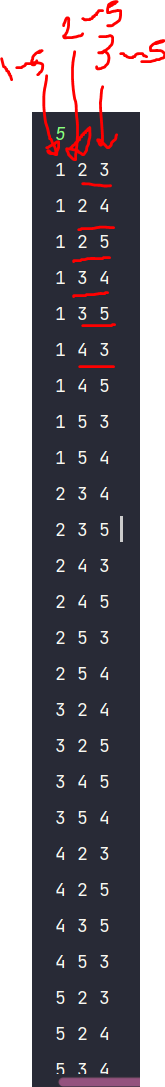 1,2가 뽑힌상황에서 보면 시작인덱스는 3일테니 3,4,5 와 조합하여 만들어질것이며