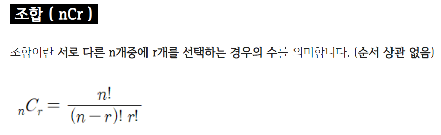 조합연습 문제 조합이란 n 개의 숫자 중에서 r 개의 수를 순서 없이 뽑는 경우를 말합니다.예를 들어 [1, 2, 3] 이란 숫자 배열에서 2개의 수를 순서 없이 뽑으면[1, 2] [1, 3] [2, 3]이렇게 3 개가 나옵니