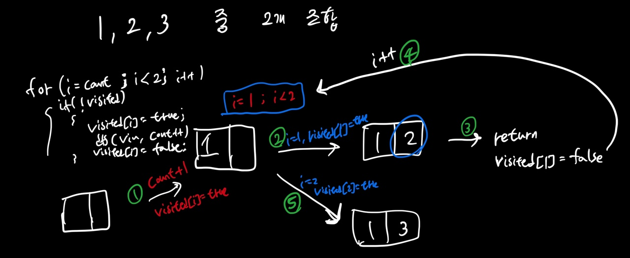 1을 뽑고 visited[0] = true 한후(1을 뽑았다는 의미) dfs() 하고 visited[0] = false (1을 뽑지않았다는 의미)를 하면 해당 반복문의 인덱스가 증가해서 1가되고 그다음 visited[1]이 true인지 검사후 ,