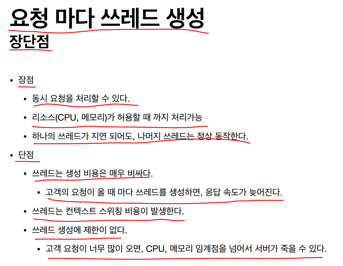 쓰레드 생성에 제한이 없다보니 요청이 많으면 서버가 죽는 단점이 있다.