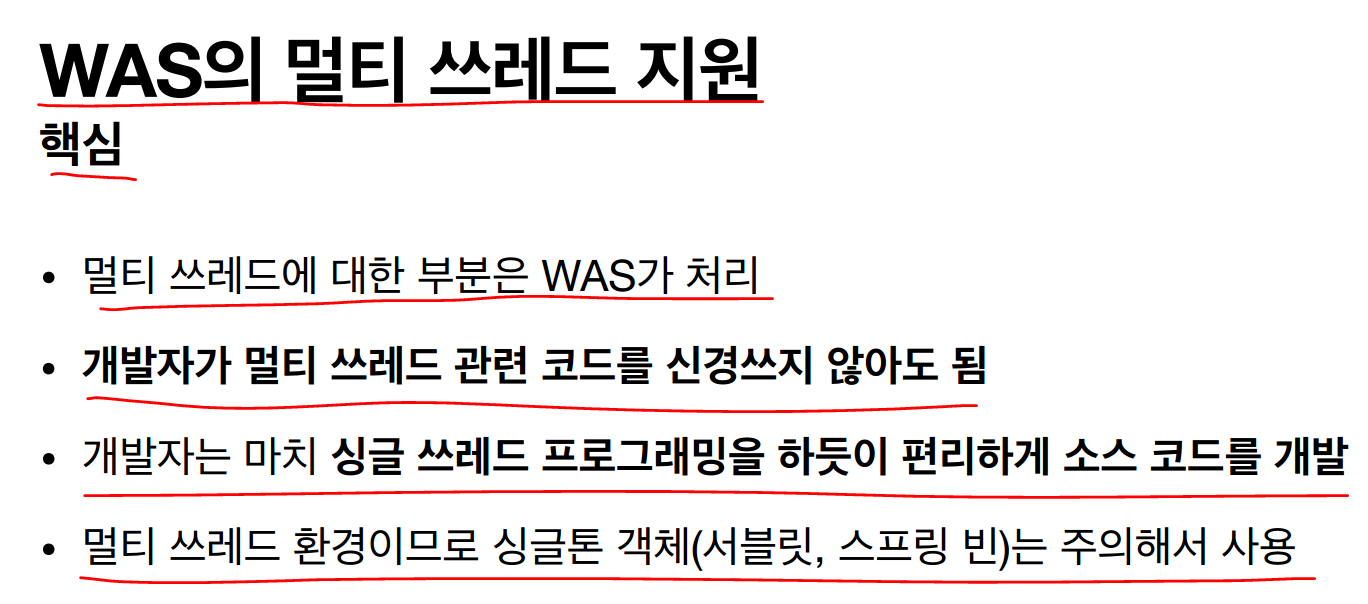 결국 핵심은 WAS가 멀티 쓰레드를 지원해준다는것이다.