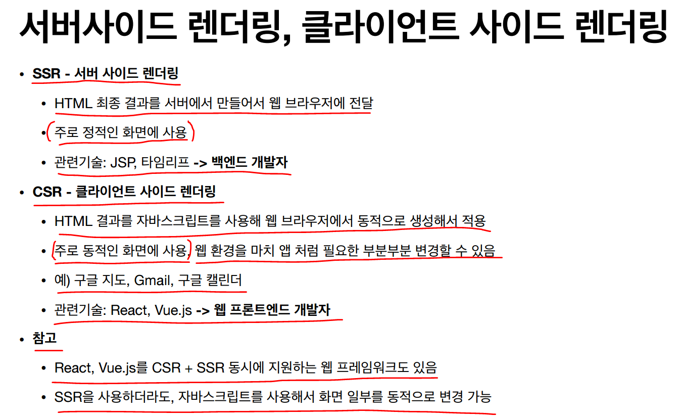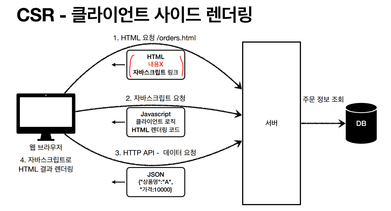 데이터와 자바스크립트안에 클라이언트로직,렌더링코드를 이용해서 자바스크립트로 HTML를 만들어 렌더링한다.