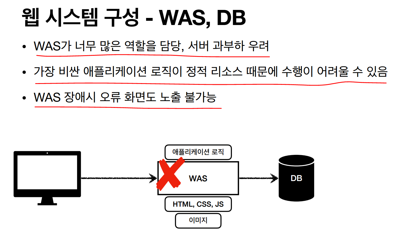 하지만 정적리소스인 html,css,이미지 같은것은 저장해두고 전달해주기만해서 비용이 많이 들지않지만 어플리케이션 로직이 비용이 많이든다. 그래서 was만 사용하게 되면 서버 과부하 우려가 있다.