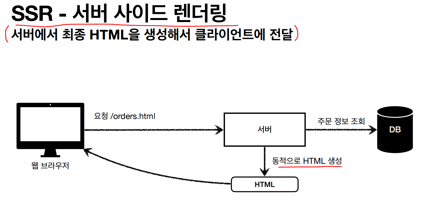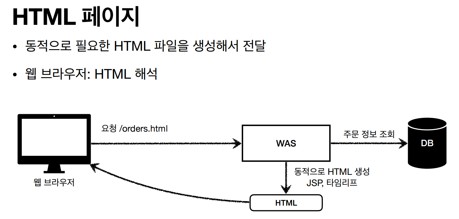 WAS가 DB를 통해 주문정보 조회하는 로직을 실행하고, 동적으로 HTML를 생성한다(JSP나 타임리프를 가지고)