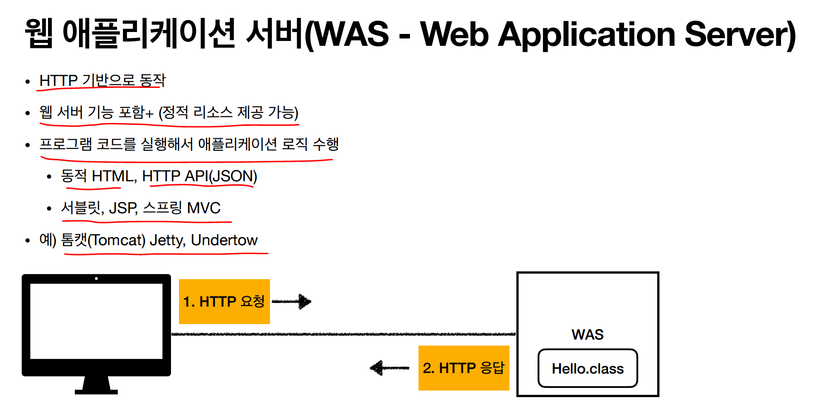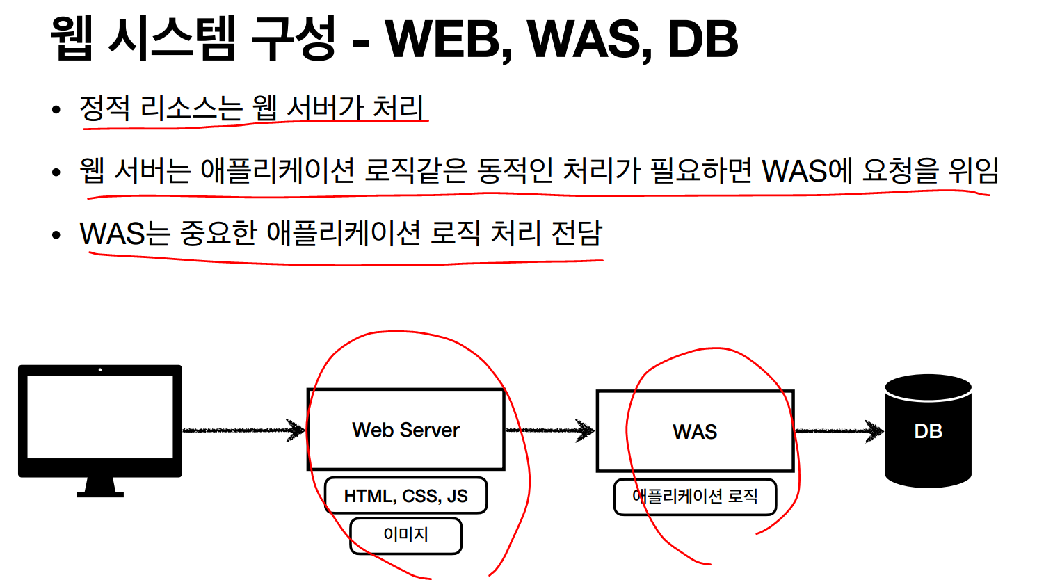웹서버는 정적리소스를 웹 어플리케이션서버(was)는 어플리케이션 로직을 실행하는 서버라고 생각하면 된다.