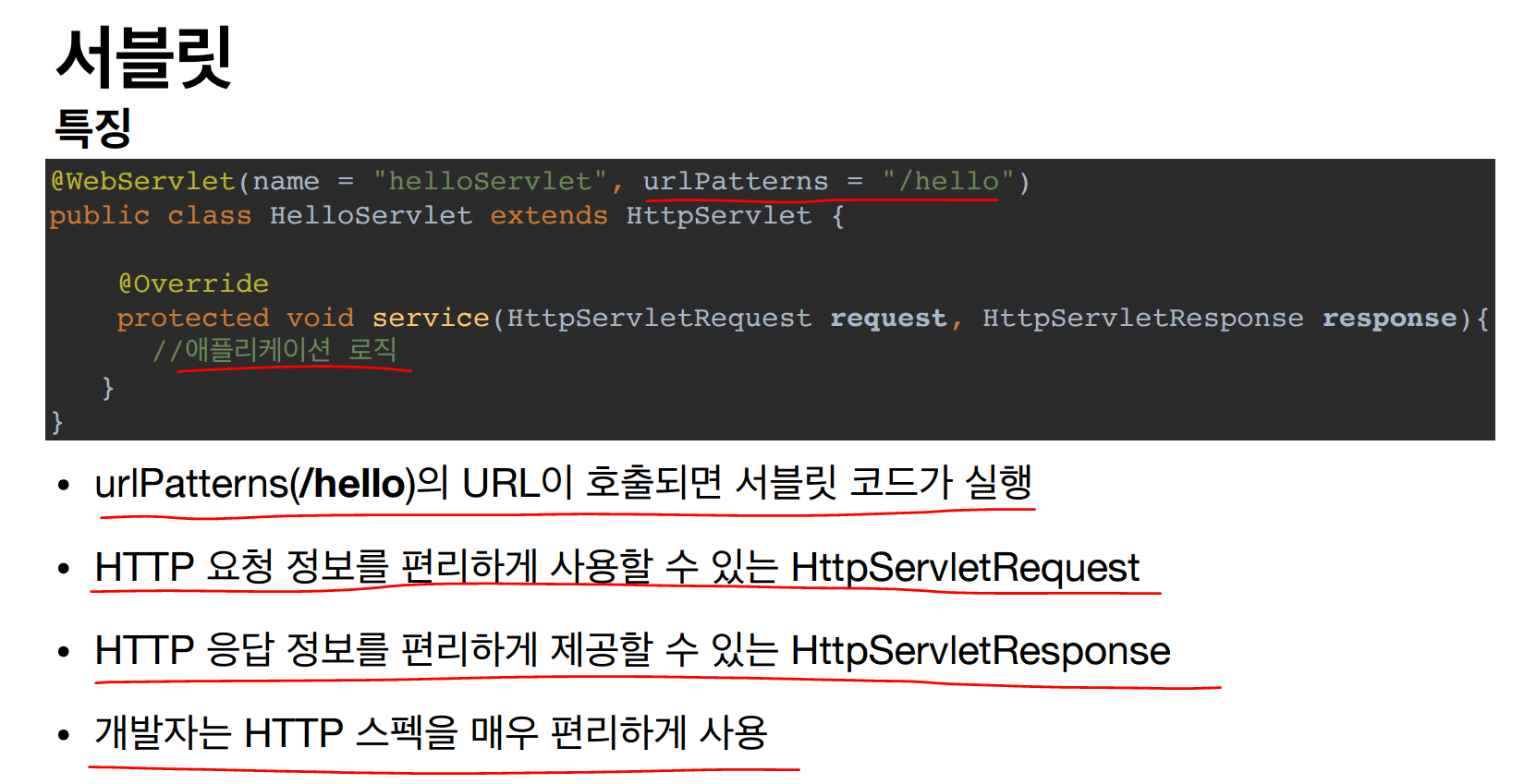 HttpServlet이라는것만 상속받아 서블릿클래스를 만들어서 어플리케이션 로직만 작성해주면 된다.