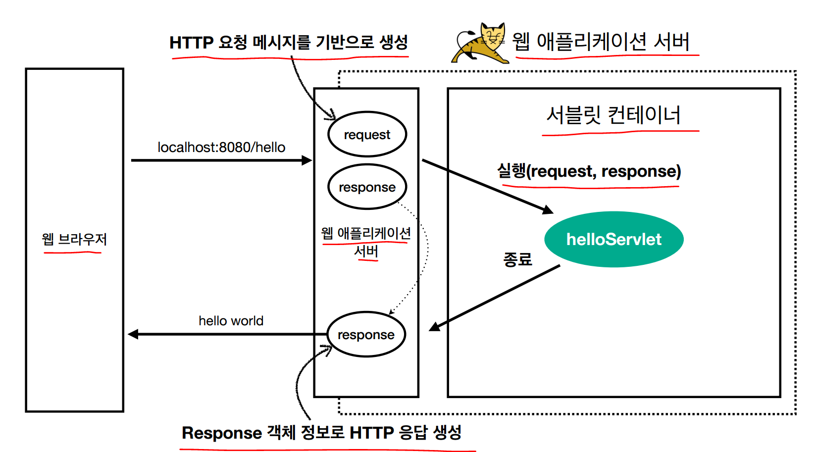helloServlet이 끝나면서 서블릿response객체를 이용해서 http응답메시지를 생성해서 웹브라우저에 전달해준다.
