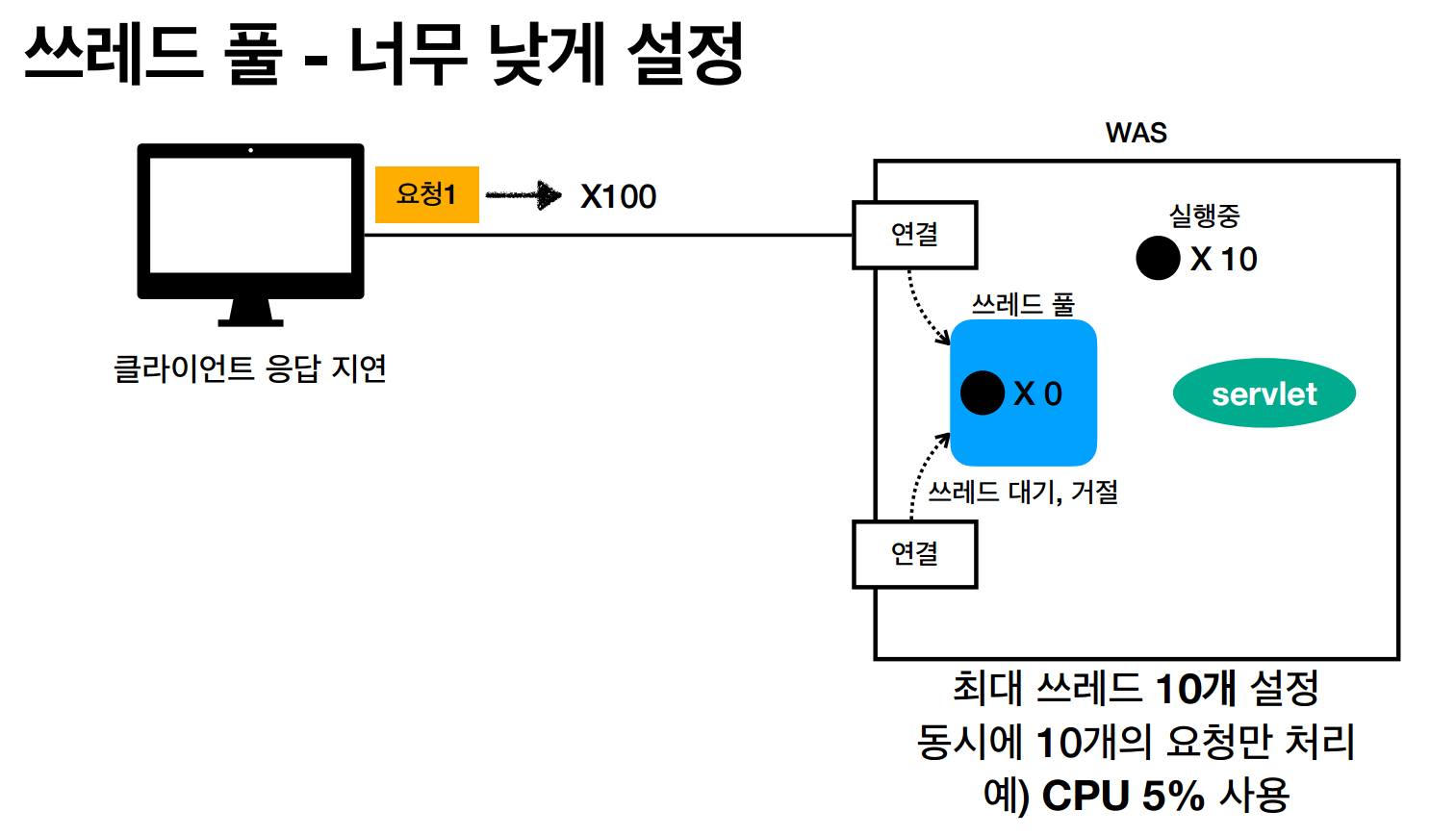 너무 낮게 설정되어있어서 cpu사용량이 낮을경우, 대기가 계속생기게 되고 결국 서비스 장애가 된다.