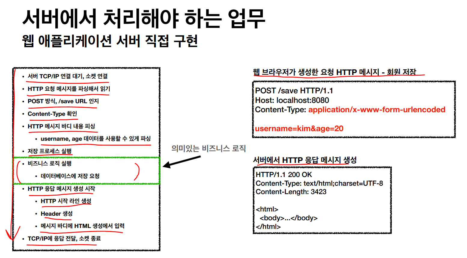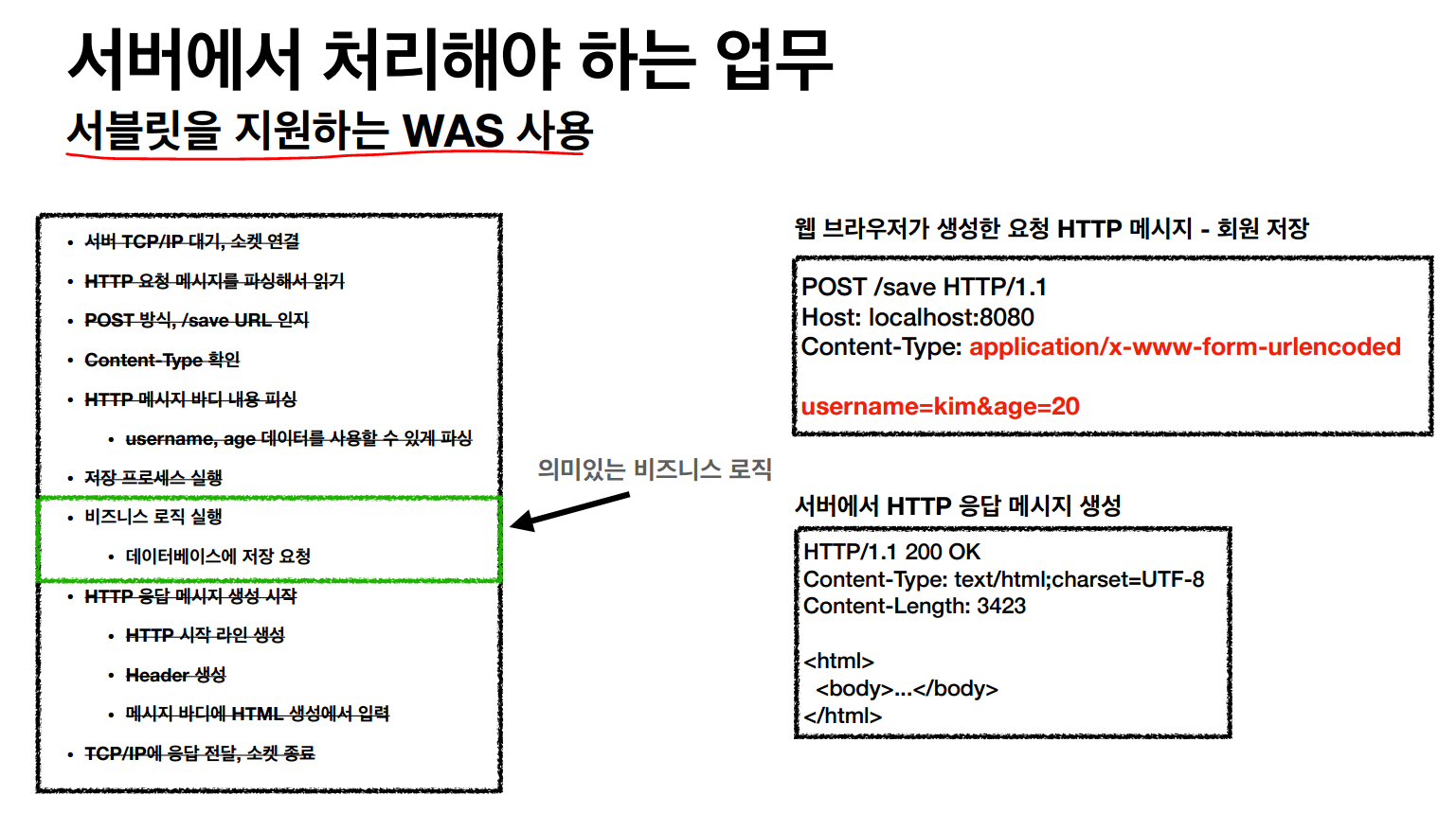 서블릿은 초록색으로 표시된 비즈니스 로직을 제외한 나머지 작업들을 지원해준다.