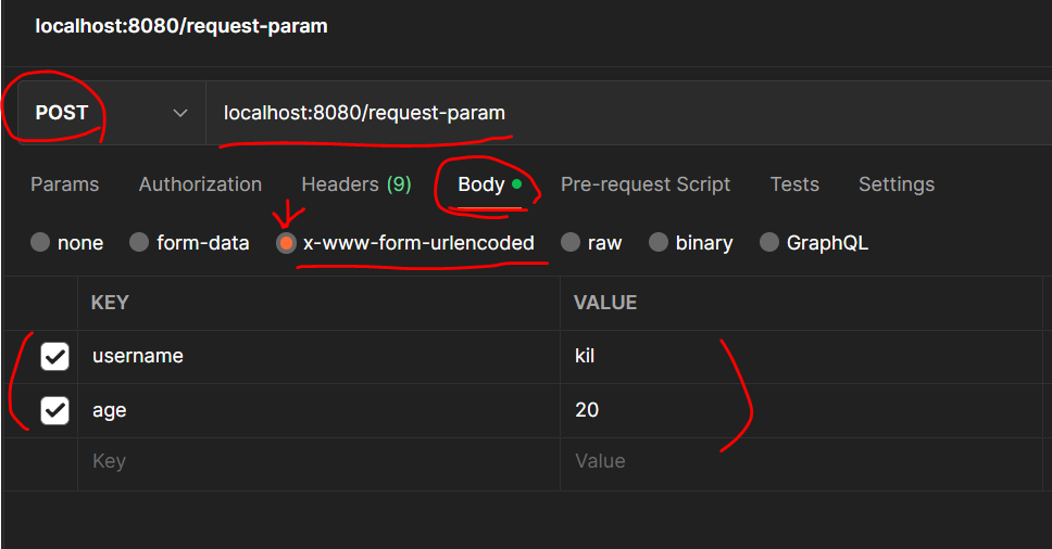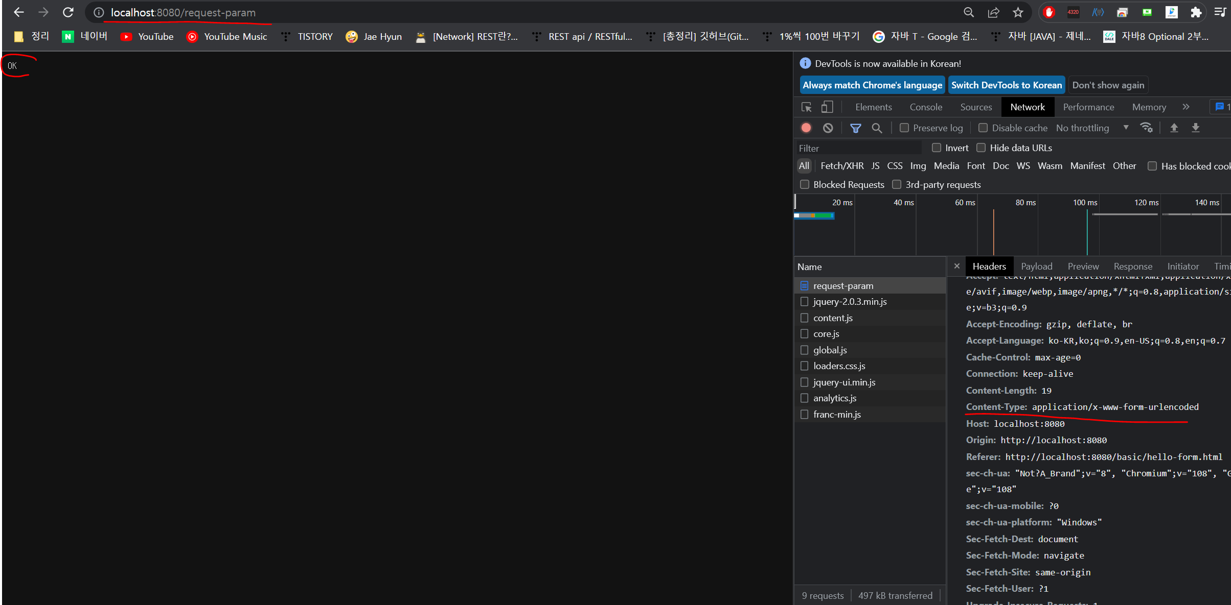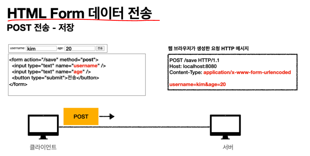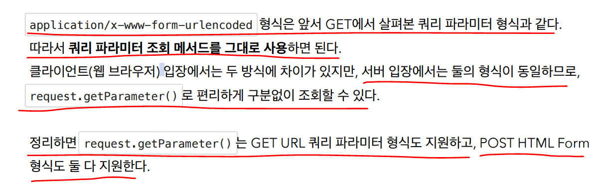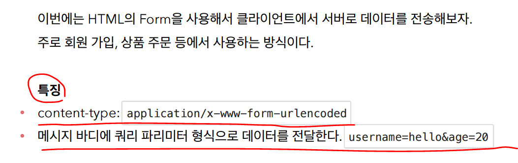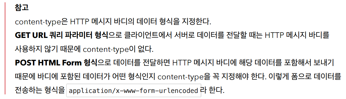 2. post방식 -> html form으로 보내는방법은 메시지 바디에 쿼리 파라미터 형식으로 전달한다. contentType은 application/x-www-form-urlencoded이다. 이 type을 보면 html form으로 데이터를 전송하고 있다고 보면된다.