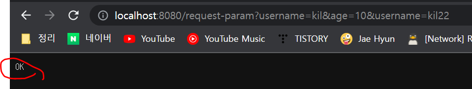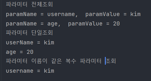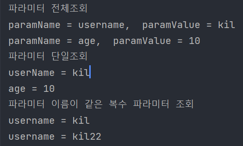 request.getParameterNames().asIterator().forEachRemaining(paramName -> System.out.println( //모든 파라미터이름을 받아, 파라미터 값을 출력