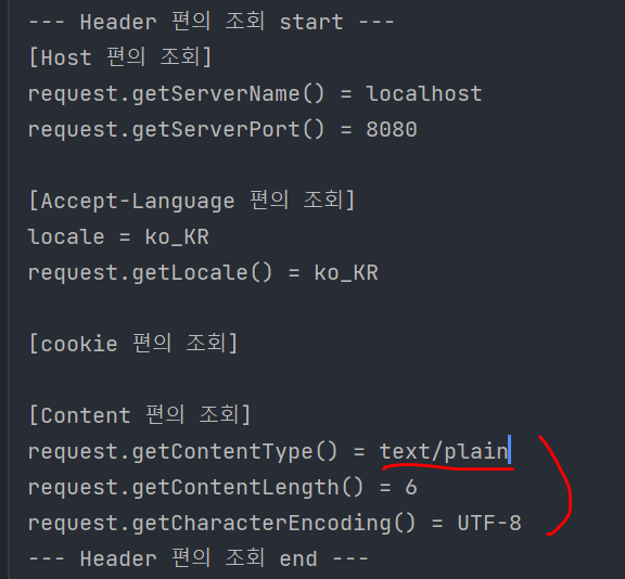 여기서는 localhost:8080/request-header로 get방식으로 url를 호출했기에 .getContentType()를 했을때 null이 나온다.(바디에 데이터가 없으니까) http://localhost:8080/request-header?username=kim이런식으로 쿼리스트링을 보내도 getContentType의 값은 null이다. contentType은 쿼리가아닌 body로 담겨오는값에 대한 정보이기 때문이다.