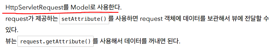 //모델에 데이터를 보관해줘야한다. 모델에 데이터를 보관하고 jsp를 호출해서 모델의 데이터를 꺼내서 html를 만들고 응답으로 전달해줄것이다.