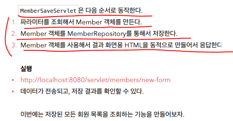 html form을 통해 데이터를 받아서 멤버객체를 만들고 저장하고 결과 화면용 html를 동적으로 만들어서 응답하는